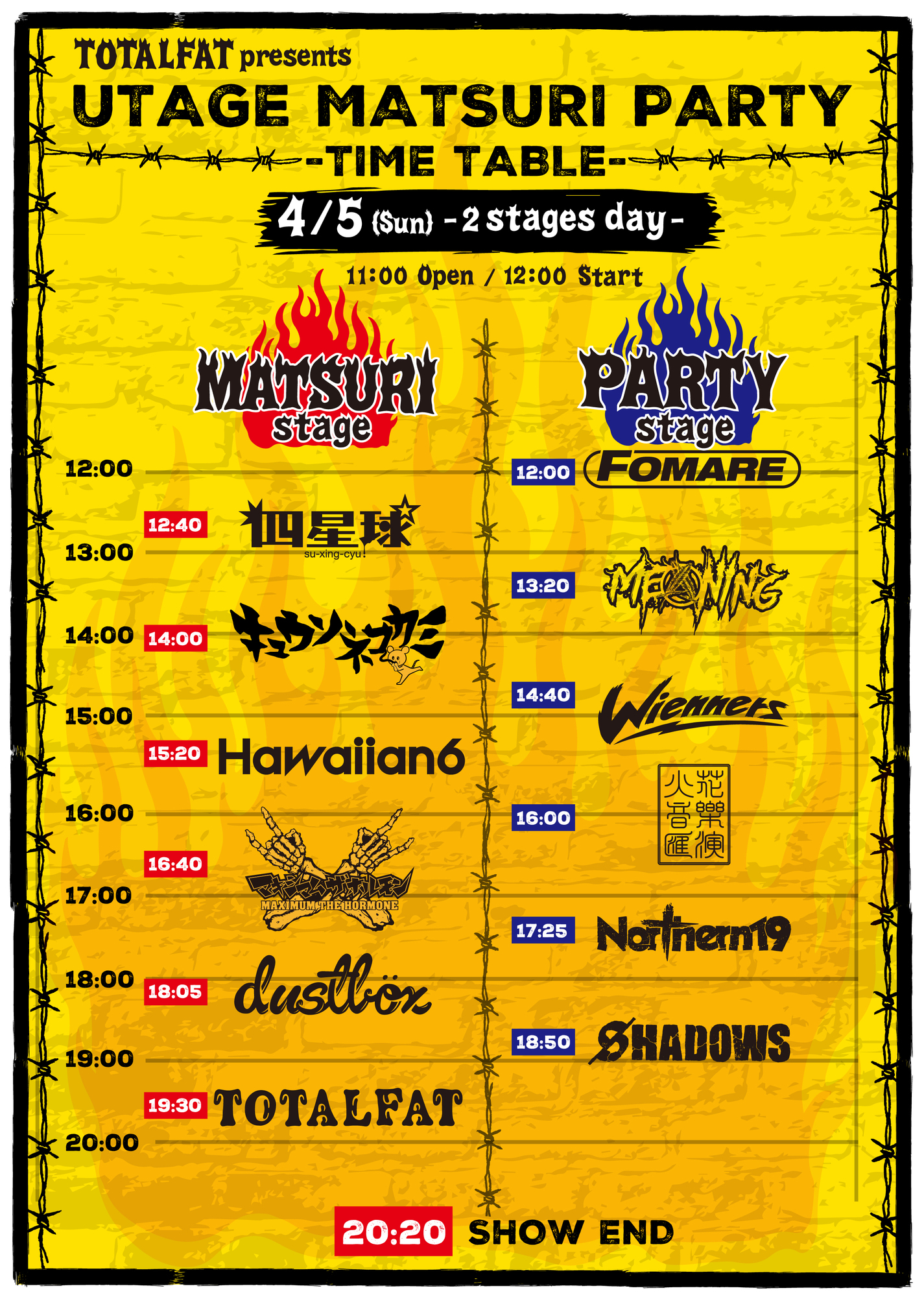 2026年4月4日(土)5日(日)開催 東京都 Zepp DiverCity TOKYO『TOTALFAT pre. "UTAGE MATSURI PARTY"』タイムテーブル発表☆