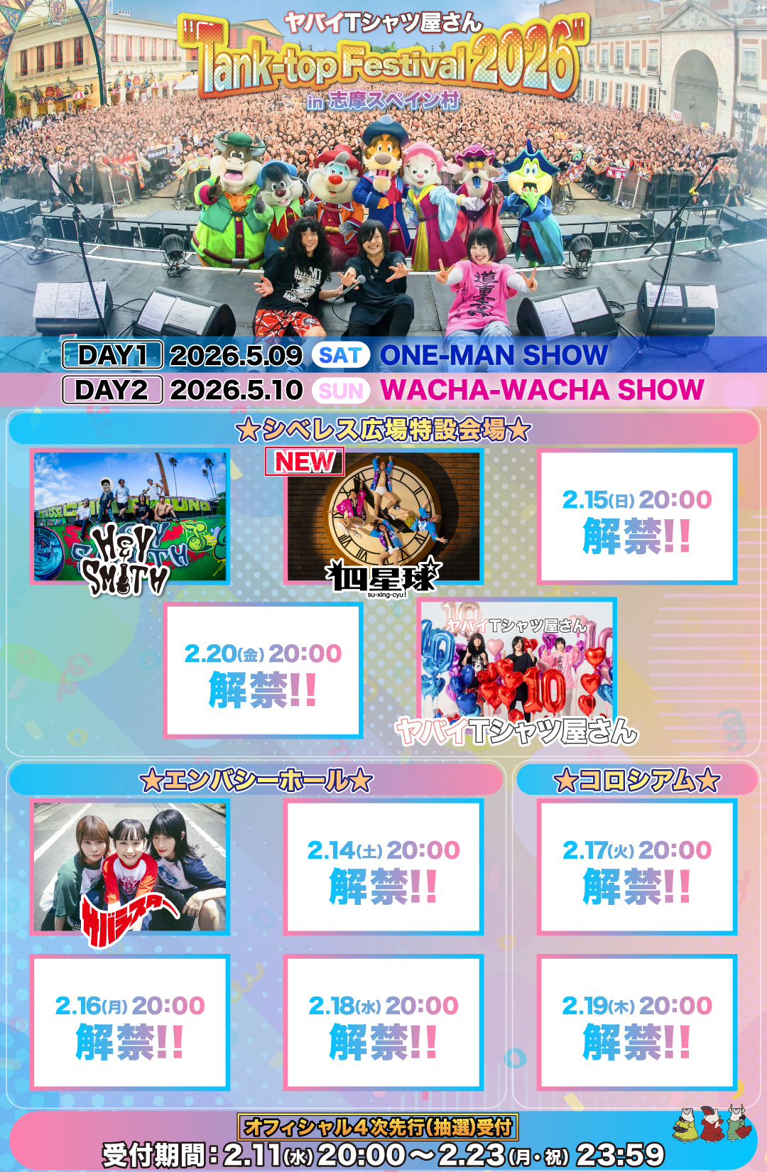 2026年5月9日(土)10日(日)開催 三重県志摩市 志摩スペイン村パルケエスパーニャ『ヤバイTシャツ屋さん "Tank-top Festival 2026" in 志摩スペイン村』出演決定☆