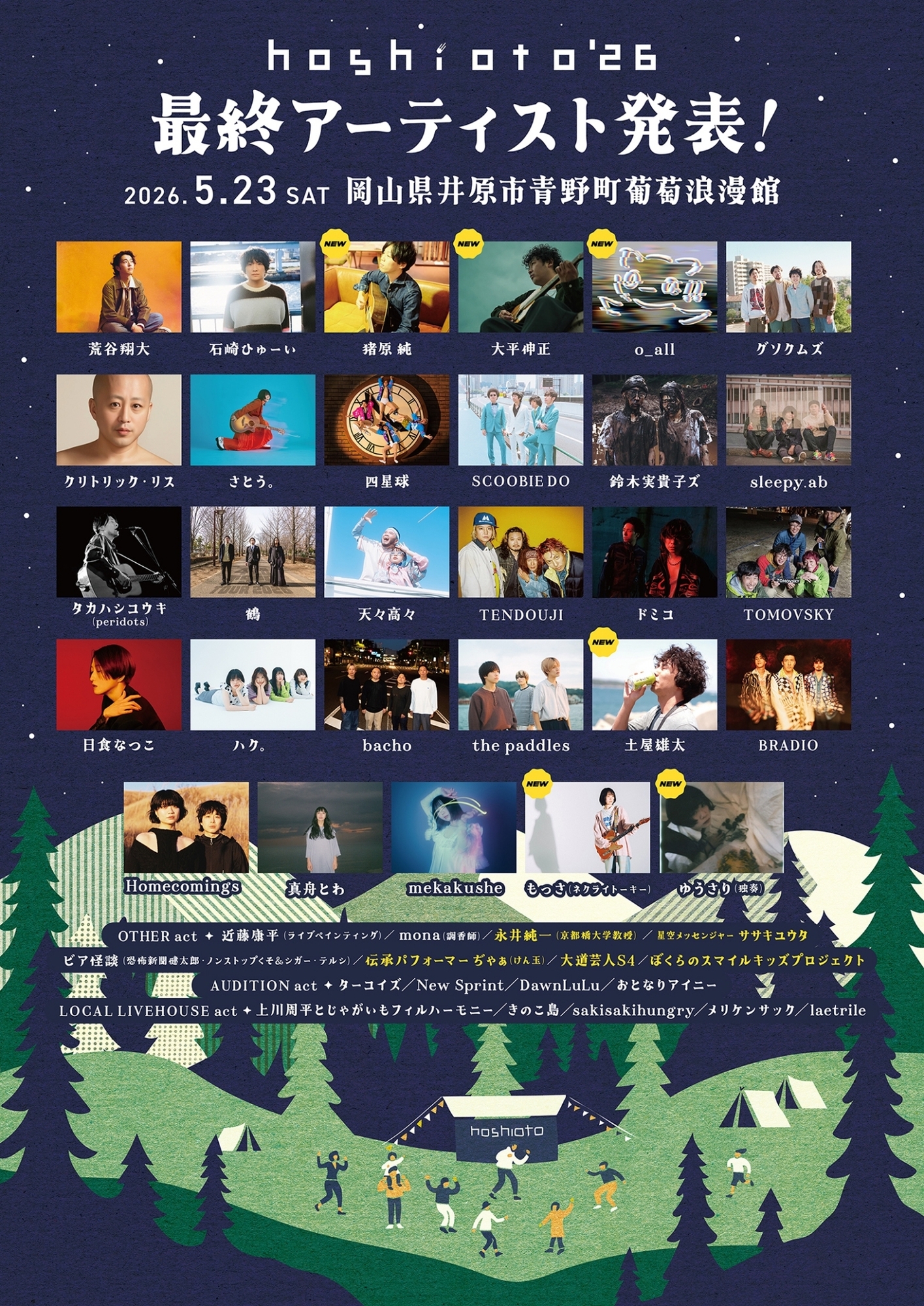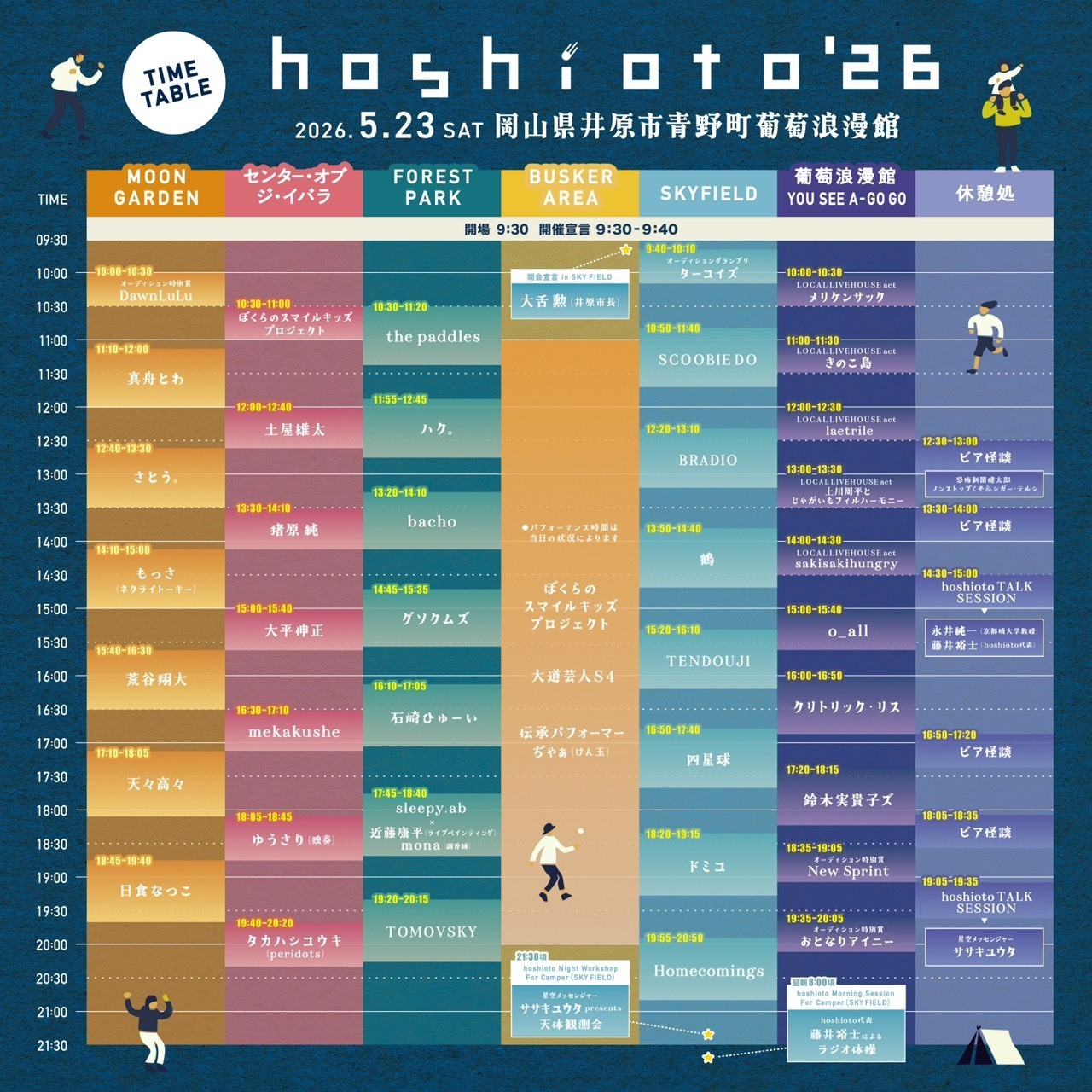 2026年5月23日(土)岡山県井原市青野町 葡萄浪漫館 特設ステージ『hoshioto'26』最終ラインナップとタイムテーブル発表!