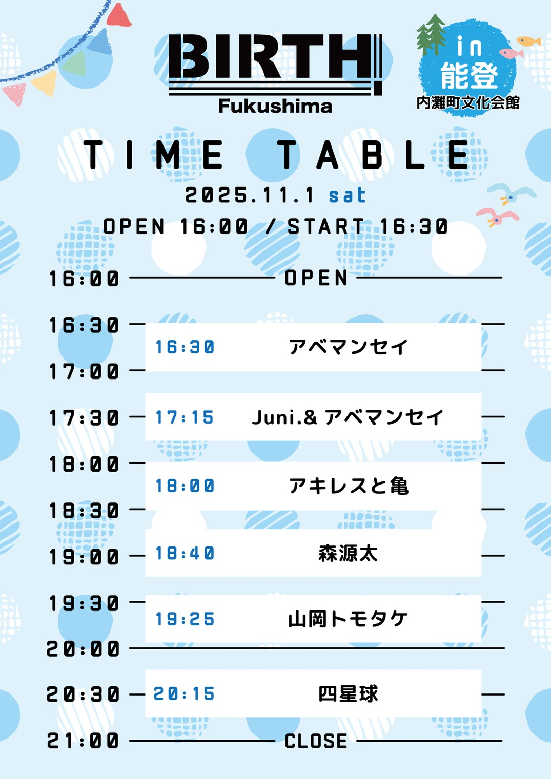 2025年11月1日(土)石川県 内灘町文化会館 大ホールフロア『BIRTH福島in能登』タイムテーブル発表☆